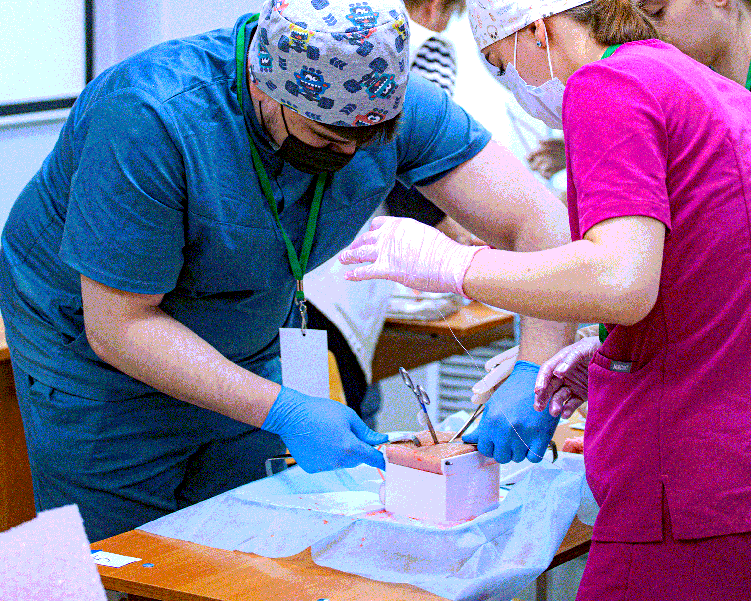 - Хирурги тренируются накладывать кожные, сосудистые и кишечные швы, останавливать кровотечение, перевязывать сосуды и формировать анастомозы.